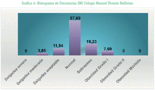 Se ha observado durante el pasar de los años un gran aumento de personas que sufren de diferentes enfermedades entre ellos el sobrepeso y la obesidad que pueden ser factores predisponentes para enfermedades como la diabetes, osteoporosis y hipertensión arterial; al realizar nuestro estudio se observó en las tablas y graficas 4 y 5 que el porcentaje de delgadez severa, sobrepeso y obesidad grado I aumentan en las personas de 20 a 32 años con respecto a los estudiantes de colegio de 16 a 18 años esto debido a muchos factores entre ellos los más importantes el sedentarismo y la mala alimentación por el gran aumento de alimentos hipercalóricos que son ricos en grasa, sal y azúcares pero pobres en vitaminas, minerales y otros micronutrientes, que se ve que va en aumento día a día en nuestra sociedad ya que no hay conocimiento sobre de cómo llevar una vida saludable, ya que esto se puede lograr mediante una buena alimentación y realizar un poco de ejercicio. También es importante mencionar que a la mala alimentación puede generar delgadez ya sea de manera severa, moderada pero en nuestro estudio no se encontraron porcentajes altos de estos casos, pero cabe resaltar que por la mala alimentación se puede llegar a presentar delgadez severa y esto también es un problema de salud para la sociedad a nivel local, nacional y mundial.