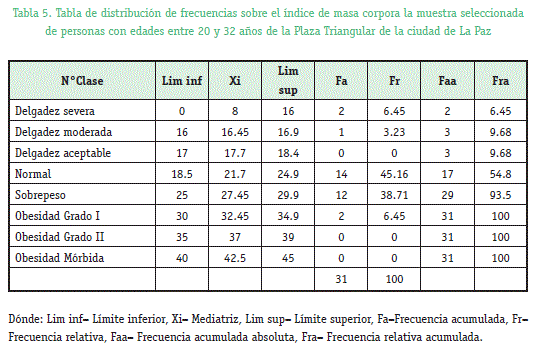 El sobrepeso y obesidad se considera un importante problema de salud en la sociedad que ha ido en aumento en los últimos años y también a nivel mundial. Se realizó una comparación mediante el índice de masa corporal (IMC) en estudiantes de sexto de secundaria del Colegio "Manuel Vicente Ballivian" y personas adultas de 20 a 32 años con la participación de estudiantes de la asignatura de estadística de 2do año de la carrera de Química Farmacéutica de la UMSA. Se obtuvieron los pesos con una báscula y la altura con una cinta métrica, una vez que se obtuvieron estos datos se realizó el cálculo correspondiente para el IMC y con estos datos una tabla de distribución de frecuencias basada en una clasificación del estado nutricional según la OMS. Mediante los cálculos obtenidos y la tabla se observó que en la Unidad Educativa un 3.85% presenta delgadez moderada, 11.5% delgadez aceptable, 57.7% normal y 19.2% sobre peso y 7.69% obesidad grado I. Y en las personas adultas un 6.45% delgadez severa, 3.23% delgadez moderada, 45.2% normal, 38.7% sobrepeso y 6,45% obesidad grado I. En nuestro estudio se pudo determinar que el porcentaje de delgadez severa y sobrepeso aumenta en las personas de 20 a 32 años con respecto a los estudiantes esto debido a muchos factores entre ellos los más importantes el sedentarismo y la mala alimentación por falta de información respecto al tema.