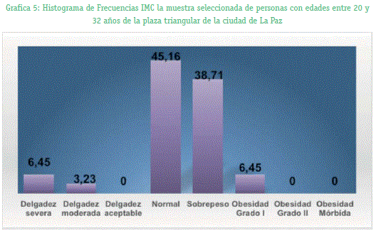 Se realizó una comparación estadística del grupo conformado por estudiantes del colegio Manuel Vicente Ballivian y la muestra seleccionada de personas con edades entre 20 y 32 años de la plaza triangular de la ciudad de La Paz, en la tabla 4 que se refiere al colegio se observó que un 0% presenta delgadez severa, 3,85% delgadez moderada, 11,5% delgadez aceptable, 57,7% normal, 19,2% sobrepeso, obesidad de grado I un 7,69% y 0% obesidad grado II y obesidad mórbida; en la gráfica 4 se observa una distribución normal donde el mayor porcentaje del 100% se encuentra en estudiantes con IMC normal que es lo que se esperaba y que significa que presentan una buena condición física ya que la relación de su estatura con su peso es aceptable. Por lo contrario podemos observar en la tabla 5 de la muestra seleccionada de personas con edades entre 20 y 32 años de la plaza triangular de la ciudad de La Paz que hay un 6,45%de delgadez severa, 2,23% de delgadez moderada, 0% de delgadez aceptable, en lo normal están un 45,2%, sobrepeso 38,7%, 6,45% de obesidad grado I y 0% obesidad grado II y obesidad mórbida, en este grupo de personas podemos observar que no hay una gran diferencia entre las que presentan un IMC normal y las personas que presentan sobrepeso, también esto se puede observar en la gráfica 5 donde la gráfica no presenta un comportamiento normal y hay gran variación de resultados.