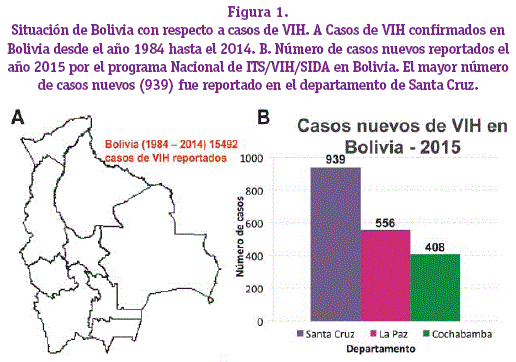 En Bolivia según datos registrados del Programa Nacional de ITS/VIH/SIDA, desde 1984 hasta el 2014 se han registrado 15492 casos confirmados de VIH (Figura 1A), de los cuales 2989 casos corresponden al departamento de Cochabamba. En el año 2015, se han reportado 939 casos nuevos en Santa Cruz, 556 en La Paz, y 408 corresponden a Cochabamba (Figura 1B). La distribución por edad y género es: de cada 10 mujeres notificadas en el sistema con VIH, existen 17 varones en igual condición, de cada 5 casos notificados, 3 se encuentran en el grupo de edad entre 15 a 34 años, siendo 31 años la edad promedio. Con relación a la vía de transmisión del virus, de cada 100 casos notificados con VIH, 97 corresponden a transmisión sexual, 2 refieren transmisión vertical y 1 por transmisión sanguínea (Programa Nacional ITS/VIH/SIDA, 2014).