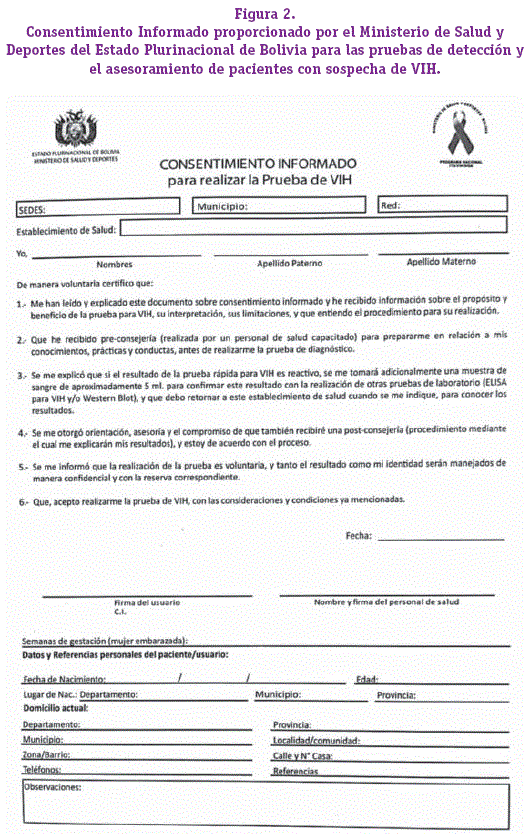 Los pacientes que acuden a los establecimientos de salud públicos o privados pueden acceder a pruebas de laboratorio para el diagnóstico presuntivo de VIH, asesoría pre y post prueba, además deben firmar un consentimiento informado (Figura 2) excepto en los casos contemplados por la ley 3729 "Ley para la prevención del VIH-SIDA, protección de los derechos humanos y asistencia integral multidisciplinaria para las personas que viven con el VIH-SIDA", sin embargo, todas las muestras de estos pacientes deben ser referidos a laboratorios de referencia.