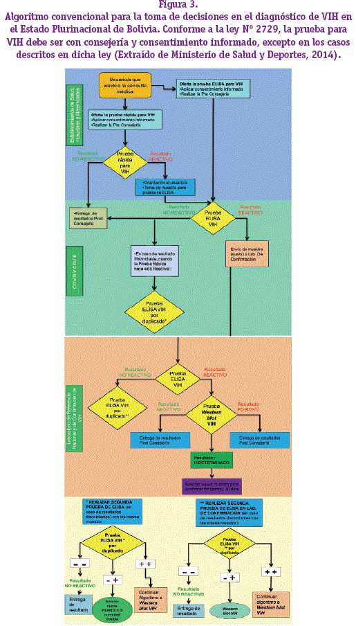La población que asiste a consulta médica que requiere prueba para VIH, puede elegir entre una prueba ELISA o Prueba Rápida en el mismo establecimiento de salud, hospital o maternidad, en ambos casos el paciente deberá firmar un consentimiento informado y se aplicará una pre-consejería; si la prueba es reactiva la muestra es referida a CDVIR para un nuevo ensayo de ELISA. Las muestras reactivas, son enviadas al laboratorio de referencia departamental y de confirmación de VIH. El laboratorio de referencia realiza la prueba de ELISA para VIH, si el resultado es no reactivo se repite la prueba por duplicado y para la confirmación de resultados reactivos obtenidos por ELISA se utiliza Western blot. El Western blot puede arrojar en algunos casos un resultado indeterminado debido a que no cumple el criterio para ser clasificado como positivo y negativo, en estos casos se debe solicitar una nueva muestra luego de 30 días. Todo paciente recibirá post-consejería y los casos VIH positivos serán registrados en la ficha de notificación y reportados al Programa Departamental ITS/VIH/SIDAy/o CDVIR para seguimiento médico y tratamiento (Ministerio de Salud y Deportes, 2014) (Figura 3).