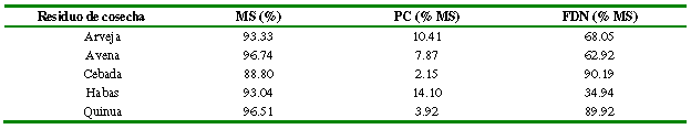 En lo que respecta a la composición química-bromatológica de los RC de los cultivos agrícolas (tabla 1), fueron la avena y quinua que presentaron los mayores porcentajes de MS.
