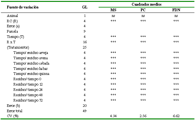 Se utilizó parcelas subdivididas conducido en un diseño de bloques completamente al azar, las dos alpacas representaron los bloques, los RC los tratamientos (parcelas) y los seis horarios de incubación de los residuos las subparcelas. El análisis fue realizado de acuerdo con el modelo estadístico: Yijk = µ + Bi + Rj + εij + Tk + R x Tjk + εijk, donde Yijk = la observación relativa al RC (j) en combinación con el tiempo (k) en el bloque (i); µ = la media general, Bi = efecto del bloque i (animal), Rj = efecto del nivel j del factor R ( RC), εij = error experimental de la parcela, Tk =efecto del nivel k del factor T (tiempo), R x Tjk = efecto de la interacción del factor R con el factor T, εijk = error experimental relativo a la subparcela. Los datos de degradabilidad in situ de la MS, PC y FDN de los RC fueron determinados por la diferencia entre el peso de las muestras incubadas y el peso de los residuos de MS, PC y FDN después del tiempo de incubación, y expresados en porcentajes23.