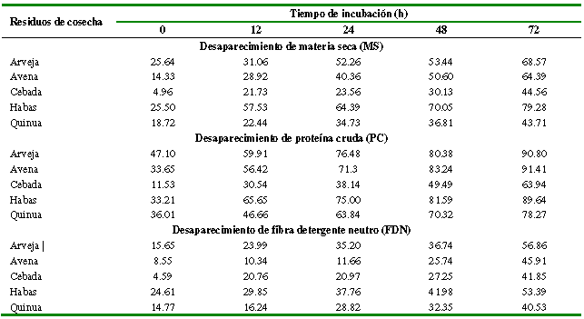 | Tabla 3 Porcentajes medios del desaparecimiento de la materia seca (MS), proteína cruda (PC) y fibra detergente neutra (FDN) de los residuos de cosecha de los cultivos agrícolas de cebada, avena, arveja, quinua y habas, en función al tiempo de incubación |