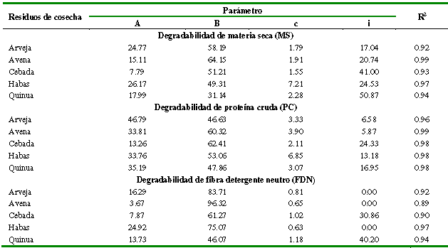 Los valores de degradabilidad potencial de la PC fueron superiores a 80 %, excepto para la cebada (75.67 %) (tabla 5). Estas cifras indican un buen potencial para la producción de nitrógeno microbiano, a pesar de los bajos contenidos de PC, especialmente de los residuos de cebada y quinua (tabla 3).