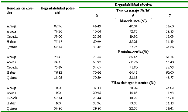 En la tabla 5 se encuentran los valores de las degradabilidades efectivas de la MS, PC y FDN de los residuos agrícolas de cosecha. Las degradabilidades efectivas de la MS en las tasas de pasajes de 3, 5 y 7 %/h fueron mayores para los residuos de habas con relación a los otros residuos.