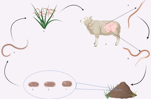 El ciclo de vida de los nematodos corresponde al tipo monoxeno (Figura 1), es decir, no presenta hospederos intermediarios, dicho ciclo comprende las etapas: huevo morulado (1), huevo embrionado (2), larva en primer estadio (3), larva en segundo estadio (4), y larva de tercer estadio o infectante (5).