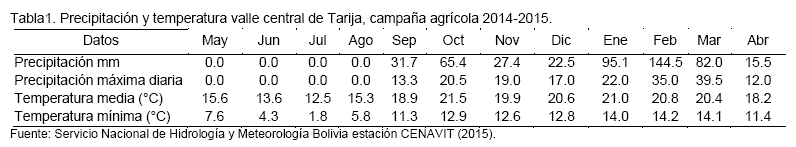 El valle central de Tarija es una región de serranías y colinas, de clima templado, con una temperatura promedio de 18 °C y una precipitación de 480 mm anuales distribuida entre las estaciones de primavera y verano. Se encuentra situado a 1 854 m s.n.m. (Pszczolkowski, 2009) en la Tabla 1 se presentan los datos climáticos del periodo que se realizó el estudio.