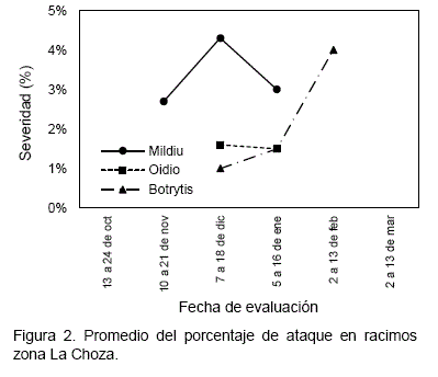 Botrytis en racimo se registró entre el 19 de enero hasta el 27 de febrero, desde la pinta de los racimos hasta maduración, este periodo es de 40 días. Presentando mayor severidad entre el 16 al 27 de febrero, días antes de la cosecha. Los valores máximos registrados en esta zona durante el ciclo fueron: Mildiu 3 %, Oídio 20 % y Botrytis 3 %.