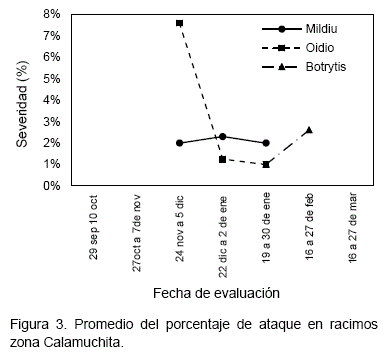 La fecha más anticipada que se observó mildiu en ambas zonas de estudio fue el 10 de noviembre y la más alejada el 30 de enero, las fechas de ataque más fuerte de mildiu se presentaron la primera quincena de diciembre en La Choza y la segunda quincena de diciembre en Calamuchita. En el caso del oídio la fecha más anticipada que se observó de ambas zonas fue la segunda quincena de noviembre y la fecha final fue la última quincena de enero. Los ataques más fuertes de oídio sobre el racimo se observaron la primera quincena de diciembre en ambas zonas de estudio.