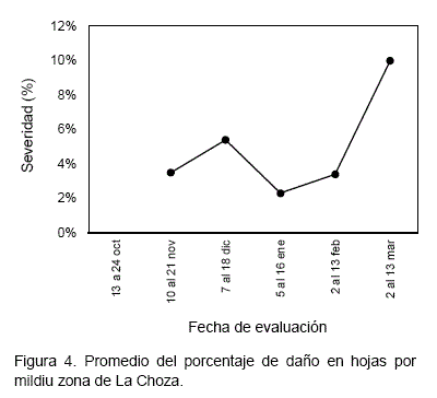 La Figura 4 presenta la evolución de los datos promedio de los daños producidos en hoja en la comunidad de La Choza.