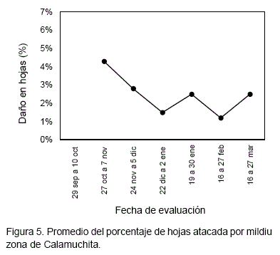 La Figura 4 determina que el mildiu se presentó en hoja desde el 10 de noviembre hasta el 13 de marzo. Este periodo es de 124 días, lo que representa el 80 % del ciclo del cultivo.