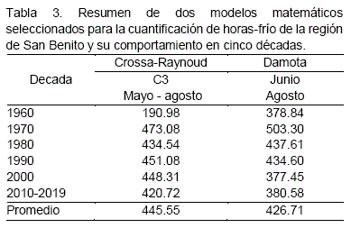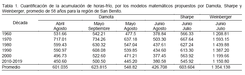 En cuanto a su comportamiento a los largo de cinco décadas se observa que en las últimas dos décadas, hubo un incremento de la acumulación de días-grado en la región de San Benito hasta un valor de 1 700, que posiblemente ha sido el resultado del efecto climático denominado la Niña y el Niño y el efecto invernadero han provocado que la temperatura promedio haya subido en 1 o 2 °C en promedio, que favorece a la acumulación de días-grado, pero también desfavorece a la acumulación de horas-frío quien se reduce paulatinamente en los últimos años, esto nos indica que para introducir variedades y especies frutales de hoja caduca en esta zona deben ser de requerimientos más bajos, ya que esto permita romper la dormancia de la yema y que la planta pueda satisfacer sus necesidades en horas-frío para una abundante floración. A la fecha sería el primer documento técnico que se ha desarrollado para establecer modelos matemáticos que puedan cuantificar horas-frío y días-grado para la región en estudio.