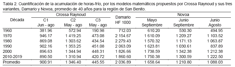 Realizando el mismo trabajo de comparación de fórmulas o modelos matemáticos propuestos por Crossa Raynoud y sus tres variantes, Damario y el método propuesto por Novoa y Villaseca (1989) se ha logrado obtener los siguientes resultados que se muestran en la Tabla 2, considerando los meses de cálculo, se obtuvieron datos superiores a las 1000 horas-frío como dato promedio de 58 años, estas metodologías han sido adaptadas a regiones con inviernos crudos y lluviosos como las regiones del mediterráneo, aspecto que no coincide con la región de San Benito, que se caracteriza por tener un invierno benigno y seco, por lo que no se consideran como modelos adecuados para la región. En relación a los datos obtenidos por las tres variantes propuestas por Crossa Raynoud, los Modelos C1 y C2 arrojan datos de acumulación superiores a las 800 HF.