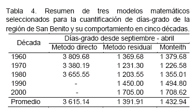 Con respecto al análisis de días grado o la acumulación de temperaturas superiores al 10°C desde el inicio de floración hasta el mes de abril, se determinó la cantidad de días-grado que acumula la región de San Benito. Según los resultados obtenidos en la Tabla 4. El método residual y el de Monteith tienen resultados similares, con un valor entre 1391 y 1432 respectivamente. Esta característica climática permitirá que variedades tempraneras, mediana estación y tardías, podrán satisfacer sus requerimientos en estos parámetros hasta completar la madurez del fruto. Por lo tanto, este dato también es importante cuando se quiera introducir nuevas variedades y especies. Los modelos matemáticos del Método residual y el de Monteith se adecuan a la región para el cálculo de esta variable climática importante para el desarrollo del cultivo de frutales.