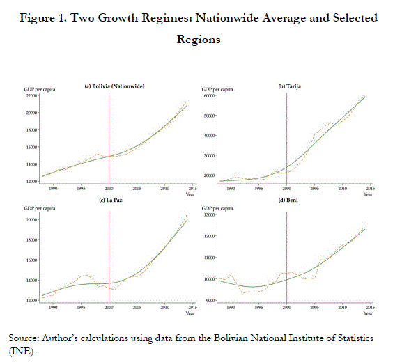 Since the late 1990s, Bolivia has experienced rapid economic growth. As shown in Figure 1, this phenomenon has characterized not only the nationwide average, but almost all its regions.§§§§§ Besides the national average, Figure 1 also includes three representative regions:****** Tarija, La Paz, and Beni, which are ordered based on their GDP per capita. Although at different initial levels, all regions show a pattern close to an exponential growth performance.