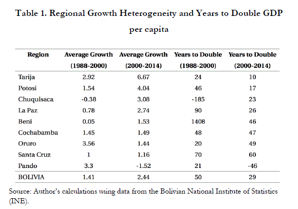Table 1 not only points the growth differences over time, but most importantly, it highlights the implications of regional growth differences. For instance, given the growth rate of the 2000-2014 period, the region of Tarija would double its GDP per capita in only 10 years. Santa Cruz, on the other hand, would need 70 years to achieve the same objective. Pando is an extreme case where the continuation of a negative growth rate would imply halving its GDP per capita in 46 years.