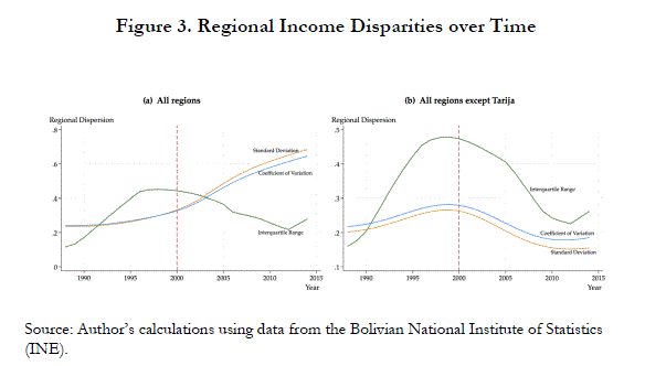 For the 2000-2014 period, however, the results are less evident. As previously shown in Figure 2, the region of Tarija is a clear outlier. And since typical measures of dispersion such as the standard deviation or the coefficient of variation are very sensitive to outliers, the measurement of dispersion via the interquartile rage seems more suitable in this case. By its construction, the interquartile rage ignores the influence of extreme outliers. When using this indicator, the 2000-2014 period shows a reduction in income dispersion across regions. Consistent with this finding, Panel (b) indicates that once Tarija is removed from the analysis, all indicators report a reduction in income dispersion.