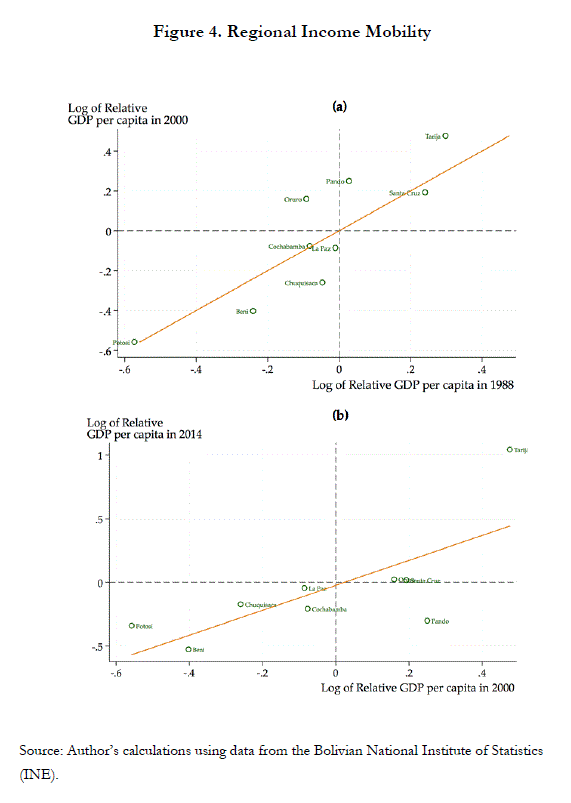 Considering the 2000-2014 period, four regions moved forward and five regions moved backward, relative to their initial position. A notable case is Pando, which used to be above the national average at the beginning of the period and ended up below the national average at the end of the period. An extreme outlier is Tarija, which shows the largest upward mobility in the whole country.