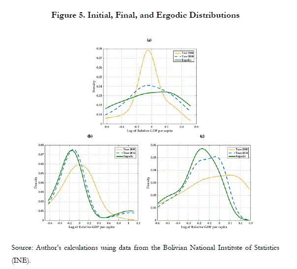 For the 2000-2014 period, Panels (b) and (c) indicate a much more complex pattern of (di) convergence. On the one hand, there is a process of convergence arising from the top of the distribution. On the other, there is a process of divergence at the bottom of the distribution. This latter pattern appears to be robust both to the inclusion (Panel b) and exclusion (Panel c) of the department of Tarija. Given the historical dynamics of the 2000-2014 period, the ergodic (long-run equilibrium) distribution also reflects these patterns of convergence from the top and divergence at the bottom. Although the convergence process seems to be stronger than the divergence process, the mode of distribution is still below the national average and there is a notoriously thick left tail when Tarija is excluded.