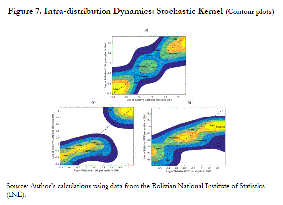 Overall, this paper contributes to the regional growth literature in three ways. From a methodological point of view, it is the first study that implements a complete distribution dynamics analysis in the Bolivian context****. Next, it applies this framework to two different sub-periods with the purpose of highlighting the nature of regional convergence patterns under different growth regimes. Finally, from the point of view of the results, it emphasizes that the process of regional convergence is complex and hence classical summary measures such as beta-convergence or sigma-convergence fail to identify the formation of regional convergence clubs in the Bolivian context.