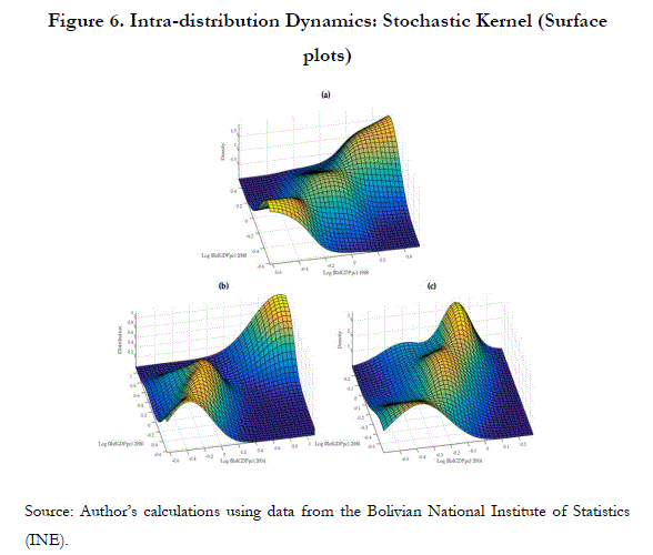 **** Although other studies, such as Caballero-Claure and Caballero-Martínez (2016), estimate basic kernel densities at different points of time, they do not estimate stochastic kernels and ergodic distributions. As argued by Magrini (2004, 2009), a complete study or distribution dynamics involves estimating kernel densities, stochastic kernels, and ergodic distributions.