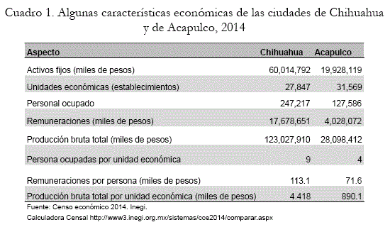 En cuanto a la producción, los datos obtenidos del Censo Económico 2014 (cuadro 1), muestran que, a pesar de tener prácticamente el mismo volumen poblacional, las diferencias del personal ocupado, así como de las remuneraciones e inversiones de estas dos ciudades son abismales. A partir de esto cobra mayor sentido el compararlas con base en el análisis realizado por el Instituto Mexicano para la Competitividad en 2012 (IMCO) que señala que Acapulco, en cuanto a su competitividad, se encuentra en el nivel muy bajo, mientras que la ciudad de Chihuahua se ubica en el medio alto. La competitividad, señala el IMCO, está relacionada con la posibilidad de invertir y, a largo plazo, mejora el ingreso per cápita y la calidad de vida.