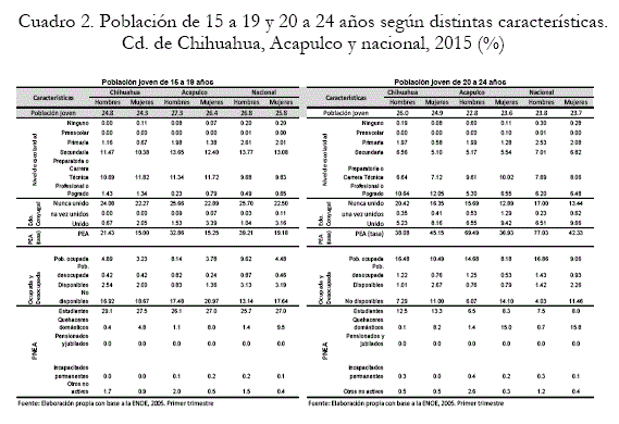 El primer punto que llama la atención es que Acapulco cuenta con una población ligeramente más joven que la de la Cd. de Chihuahua, esto se evidencia claramente al desagregar por grupo de edad a nuestro universo de estudio (cuadro 2). Con relación al nivel escolar, también se percibe que Acapulco presenta jóvenes con escolaridades menores a los de la Cd. de Chihuahua. Principalmente en el nivel medio superior y superior, donde se encuentran los jóvenes de 20 a 24 años, las distancias porcentuales entre ambas ciudades se amplían, resultando mucho más favorecidos los jóvenes del entorno de Chihuahua, quienes en mayor medida han alcanzado el nivel medio superior y superior. Otro aspecto que resalta es la diferencia entre ellos y ellas: las mujeres suelen presentar niveles de escolaridad ligeramente más altos que los hombres en las dos ciudades.