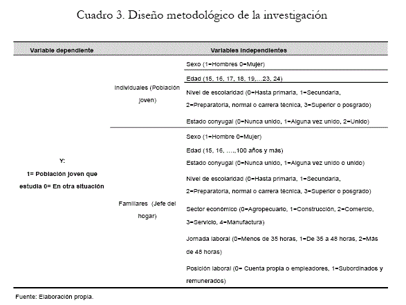 Por su parte, las variables independientes están clasificadas en individuales (características de la población joven) y familiares (aspectos del jefe del hogar) tal como se observa en el cuadro 3. En este sentido, la estimación de la regresión logística binaria muestra la probabilidad que tienen los jóvenes para dedicarse a estudiar dada su edad, sexo, nivel de escolaridad, estado conyugal,así como la edad del jefe de familia, su sexo, nivel de escolaridad, estado conyugal, sector económico, jornada y posición laboral.