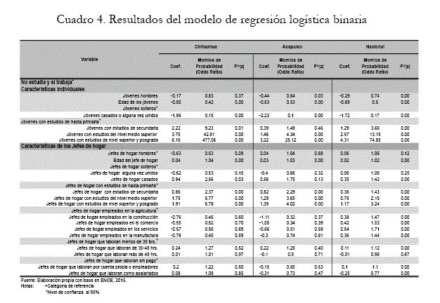 El total de la muestra ascendió a 1,095 jóvenes de 15 a 24 años de edad para Chihuahua y 1,105 para Acapulco, que representan a 151,602 y 119,753 jóvenes, respectivamente. Para descartar problemas respecto al tamaño de la muestra y que los resultados fueran consistentes para cada ciudad seleccionada, se estimó un modelo de regresión logística binaria en Stata versión 13 agregando el comando svyset, el cual declara que los datos provienen de encuestas complejas, designa variables que contienen información sobre el diseño de la muestra específica, declara el método por default para la estimación de la varianza, etc. En este caso, los resultados de la regresión logística binaria fueron consistentes.