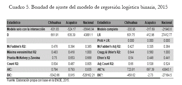 La bondad de ajuste de los modelos estimados se realizó con las siguientes pruebas: máxima verosimilitud, la X2, Pseudo R2 o McFadden R2, Pseudo R2 Ajustada o McFadden R2 Ajustada, Count R2, Count R2 Ajustada, AIC, BIC, entre otras§§§(cuadro 5). Los resultados sugieren un buen ajuste por parte de ambos modelos, para el caso de Chihuahua el ajuste asciende a 66.0% mientras que para Acapulco fue de 53.8%. Estas cifras representan la proporción de predicciones correctas derivadas de los modelos estimados. Asimismo, para comprobar si los coeficientes de las variables independientes eran estadísticamente significativos se llevó a cabo el test de Wald, la probabilidad asociada al valor z. También se analizó la significancia de dos variables simultáneamente y se comprobó estadísticamente si el efecto de dos coeficientes era el mismo.