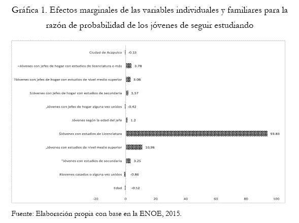 Respecto a la situación de las ciudades en las que habitan, es decir, comparando la importancia del contexto de Acapulco y de la ciudad de Chihuahua, los resultados muestran que en el puerto la población joven tiene 15% menor probabilidad de seguir estudiando en comparación con los jóvenes de la otra ciudad del análisis. Este hallazgo, aunque no estadísticamente significativo, evidencia que las condiciones de la localidad sí influyen para que los jóvenes, en este caso, tengan más o menos oportunidades de educación. De manera que no sólo son características o decisiones individuales o del jefe de hogar sino también interviene el territorio donde se desenvuelven, el contexto donde se desarrollan y la estructura de oportunidades que se ofrecen. En este estudio, de manera más precisa, los jóvenes de la ciudad de Acapulco tienen mayor posibilidad, respecto de aquellos jóvenes que residen en la de Chihuahua de abandonar la escuela.