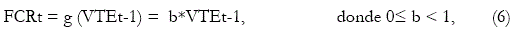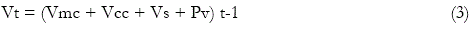 donde el valor de la producción en el ciclo t corresponde al valor de las materias primas consumidas, más el valor del capital consumido, más el valor de los salarios pagados, más el plusvalor, todos en el ciclo t-1 anterior. Y el valor obtenido por la venta de la producción Vt se distribuye en la siguiente iteración t+1, sustituyendo Pv en (3) de esta manera: