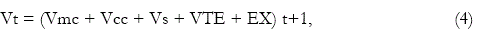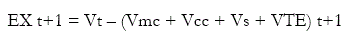 de (4) se desprende que, en la siguiente iteración del ciclo de los negocios t+1, el valor del producto en el mercado (Vt) se distribuye en la siguiente iteración de la acumulación de capital entre el Valor del Capital (fijo y variable) utilizado en la producción (que contemplan las variaciones en ellos decididas por la empresa para esta iteración), el valor del trabajo (Vs) que requieran tales variaciones y en correspondencia con la negociación hecha con los trabajadores para esta iteración, y en un remanente que se debe distribuir entre el Valor del Trabajo Empresarial VTE y el excedente EX.