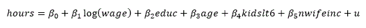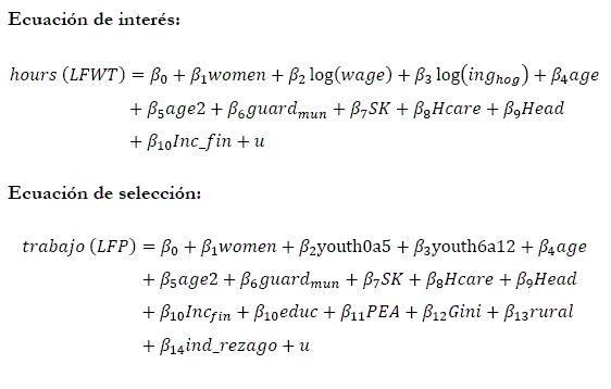 Este modelo considera la oferta laboral de las mujeres en la fuerza laboral, donde hours se refiere a las horas trabajadas y está en niveles, wage se refiere a los sueldos y salarios, age es la edad, educ es la educación, kidslt6 se refiere a los niños menores de 6 años de edad, nwifeinc es el ingreso del hogar (que incluye los ingresos del esposo). Con base en el modelo de Wooldridge (2000) se definen: la ecuación de interés y la ecuación de sección, la especificación final de ambas ecuaciones proviene de la revisión de la literatura:
