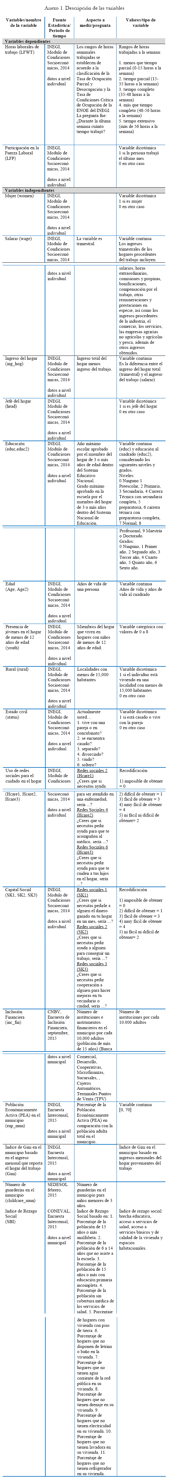 En este estudio nos centramos en los factores del lado de la oferta laboral, la demanda laboral y los factores macro no se consideran aquí, dado que dependen de otras condiciones estructurales del mercado, por ejemplo de las rigideces de los precios. El marco conceptual establece que las decisiones laborales no son independientes del tiempo libre y del tiempo dedicado a las necesidades no remuneradas en el hogar y el cuidado, por lo que la oferta laboral está en función de sus preferencias por tiempo y necesidades (Apps et al. 2012). En este estudio utilizamos las horas de trabajo de las mujeres como variable dependiente para probar la hipótesis de si las horas de trabajo de las mujeres dependen de su capital social, de sus necesidades de cuidado y de su inclusión financiera, para ello utilizamos variables a nivel individual y a nivel municipal donde viven las mujeres, con el fin de controlar la heterogeneidad regional. Adicionalmente, se usan como estimadores las variables tradicionales que afectan la oferta laboral como la educación, la edad, la edad al cuadrado, el salario, los ingresos en el hogar, la presencia de menores en el hogar, la existencia de guarderías en el municipio, y otras variables estructurales como la población económicamente activa en el municipio, la desigualdad, un índice de rezago social que considera variables sobre las condiciones y servicios en la vivienda y la región donde viven los habitantes de la muestra.