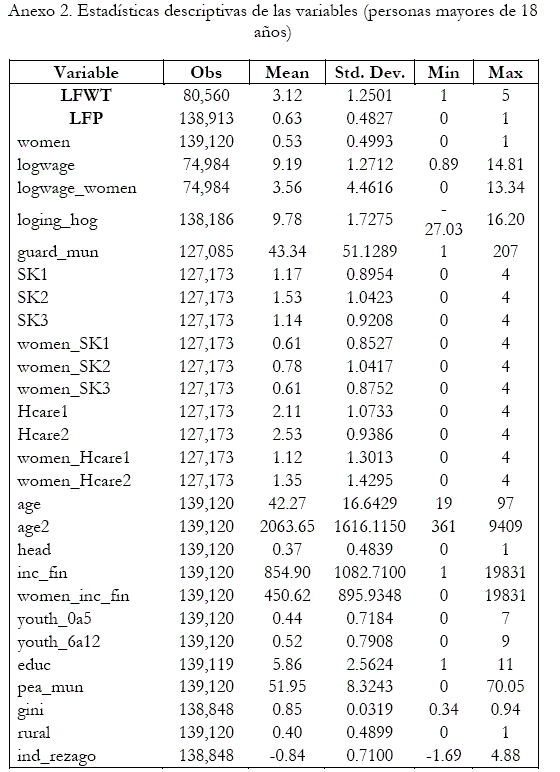 Las variables adicionales se refieren al capital social, a las necesidades de cuidados en el hogar y la inclusión financiera. En la ecuación de interés se incluyeron adicionalmente las variables estructurales (ingreso y salarios) para controlar el entorno económico de los hogares. En la ecuación de selección se incluyeron variables regionales y contextuales de los hogares.