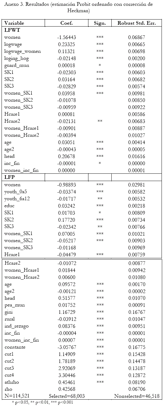 El modelo presenta problemas de sesgo de selección estadístico porque hay un error en la elección de las mujeres sobre su propensión a trabajar, ya que la probabilidad de que una mujer esté incluida en el estudio está ligada a alguno de los factores a estudiar, por ejemplo, más de la mitad de las mujeres analizadas tienen condiciones que las limitan para trabajar6, por lo que la muestra podría incluir mujeres con muy bajas probabilidades de trabajar tiempo completo, se corrigió el problema usando el modelo de Heckman (1979) en dos etapas para evitar el problema mencionado. Algunas de las variables que denotan la condición laboral de las mujeres para trabajar están relacionadas con la educación, la presencia de hijos menores en el hogar, y otras variables relevantes que no están incorporadas en el modelo porque no se dispone de información o son difíciles de identificar como el tiempo de traslado a la fuente laboral más importante o el hecho de que algunas mujeres sean más persistente en la búsqueda de empleo, que estén motivadas a trabajar o apreciar más la autonomía y la libertad. Según Heckman (1979), ignorar la autoselección puede introducir un sesgo de especificación en los parámetros estimados de la ecuación similares a los generados por la omisión de variables relevantes en el modelo.