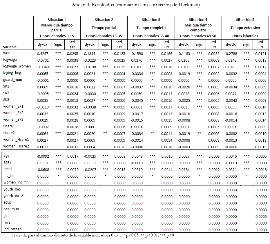 Las discusiones teóricas enfatizan que el salario es un determinante clave del aumento en la participación de las mujeres en la fuerza laboral (Cogan 1980a, 1981, 1980b, Trussell y Abowd 1980, Heckman y MaCurdy 1980, Hanoch 1980, Dooley 1982, Attanasio y Sanchez Marcos 2008). En este sentido, el aumento en la tasa salarial aumenta el costo de oportunidad del ocio y el trabajo no remunerado del hogar, por lo que aumenta la oferta laboral. Por otro lado, el número de hijos aumenta el salario de reserva de las mujeres y reduce su probabilidad de inserción al mercado laboral. En la estimación de nuestro modelo encontramos que el peso de los salarios7 de las mujeres son un factor importante para aumentar la probabilidad de trabajar más horas. De hecho, el salario de las mujeres8 es una de las variables con mayor peso explicativo en la extensión del tiempo laboral de las mujeres (anexo 3)9. El salario de las mujeres se relaciona de manera inversa con la probabilidad de trabajar tiempo parcial (-0.0108) y menos que tiempo parcial (0.0340) y de forma positiva con la probabilidad de trabajar tiempo completo (0.0180) y más que tiempo completo (0.0100), es decir, cuanto mayor es el salario de las mujeres, mayor es su probabilidad de trabajar tiempo completo, pero en el caso del tiempo parcial cuanto mayor es el salario de las mujeres, menor es su probabilidad de trabajar (-0.0108), esto podría estar relacionado con el efecto sustitución, es decir cuando el salario es elevado prefieren destinar parte de su tiempo a otras actividades que a trabajar tiempo completo, como el cuidado de los hijos u otras tareas del hogar (anexo 4), quizás porque el salario no es lo suficientemente alto como para alentar a las mujeres a reemplazar sus actividades del hogar con trabajo en el mercado laboral. Los efectos marginales de la estimación del modelo de Heckman para la corrección del sesgo de selección10 aparecen en el anexo 4 (el valor de o en las estimaciones fue de 0.4546 y fue significativa al 95%).