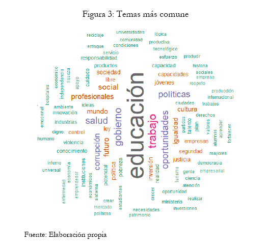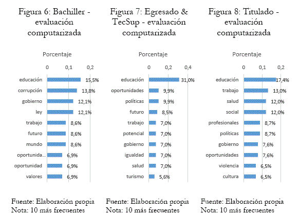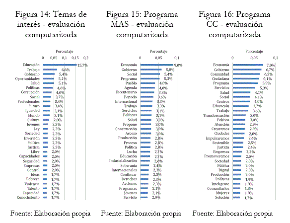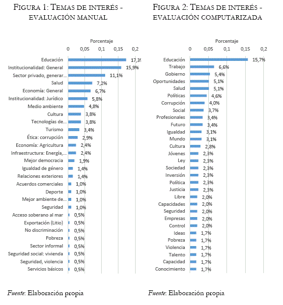 De manera similar, la evaluación computarizada refuerza los resultados obtenidos en la evaluación manual.9 Educación es el tema de mayor interés, indiscutiblemente. El tema de trabajo toma un importante segundo lugar y temas relacionados a institucionalidad se encuentran a continuación (gobierno, oportunidades, políticas y corrupción). Finalmente, el tema de salud aparece entre los cinco más importantes.