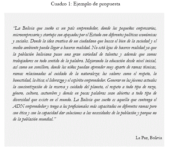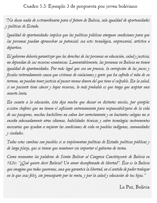A continuación, se resume el contenido de las propuestas de los jóvenes interesados en estudiar en el exterior sobre los temas que son más importantes para la Bolivia que sueñan. Es preciso resaltar que esta sección incluye también comentarios de los autores sobre las propuestas. Brevemente, se provee contexto, teorías y evidencia con el afán de vislumbrar posibles líneas de acción para políticas públicas (ver Apéndice 3 para un resumen).