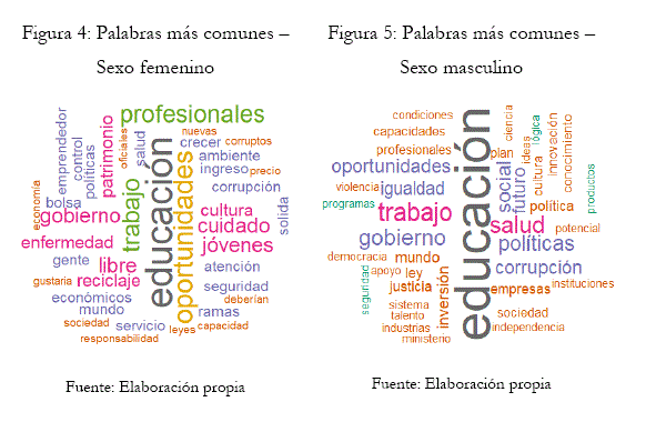 Además de los resultados para el total de la muestra, se aplicó el método computarizado para estimar frecuencias según sexo10. El tema de educación se mantiene invariable como el más frecuente para ambos sexos (entre las 30 palabras más frecuentes, toma un valor de 8.5 por ciento para el sexo femenino y 14 por ciento para el masculino). Otra coincidencia entre los más frecuentes, es el tema de trabajo (5.1 por ciento para el sexo femenino y 6.3 por ciento para el masculino). Respuestas del sexo femenino mencionan también con mayor frecuencia el tema de oportunidades (5.9 por ciento) y aspectos relacionados con temas profesionales. En cambio, el sexo masculino menciona la salud (5.5 por ciento) y temas relacionados al gobierno.