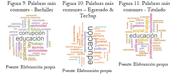 Se realizó también una comparación desagregando los datos por nivel de educación. En la muestra un 29 por ciento concluyó el bachillerato, 30 por ciento realizó estudios a nivel técnico superior o egresó de la universidad a nivel de pregrado, 37 por ciento es titulado de la universidad a nivel de pregrado y un poco menos del 5 por ciento completó algún estudio de posgrado (ver Apéndice 2). Para presentar resultados desagregados por esta variable, el estudio se enfoca en los tres primeros grupos. Nuevamente, en cada grupo desagregado, el tema de educación es el más frecuente. Para el grupo de bachilleres, la corrupción es el tema más común luego de educación mientras que oportunidades y trabajo lo son para el grupo de egresados (o con estudios de técnica vocacional) y titulados respectivamente. También se observa que el tema de salud toma más importancia a medida que se incrementa el grado de educación. Por ejemplo, salud no figura entre los diez temas más comunes entre aquellos que completaron el bachillerato. Pero, toma el noveno lugar entre los egresados y el tercer lugar entre los titulados.