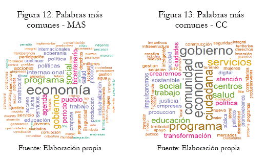 ¿Existen coincidencias entre las demandas de los ciudadanos jóvenes y las propuestas de las entidades políticas? La comparación se limita a temas que registran mayor frecuencia. Los temas de educación, institucionalidad y economía se compararon con el enfoque de los programas de gobierno presentados por distintas organizaciones políticas. El análisis utilizó el método computarizado estudiando la frecuencia en el uso de palabras dentro de los contenidos.26 Abajo, se muestra el análisis para las organizaciones políticas Movimiento al Socialismo (MAS) y Comunidad Ciudadana (CC) porque son las que en el momento de la elaboración de este estudio lideraban la intención de voto (Clarín, 2019). Los resultados sugieren que la prioridad de estas dos organizaciones políticas es la economía. De forma general, existe aquí una coincidencia con las demandas de los jóvenes. De forma particular, cuando el tema económico se enfoca en generación de empleo (trabajo), ambas organizaciones reflejan este aspecto cerca al décimo lugar en términos de palabras más frecuentes.27 Por otro lado, educación, que es el principal tema de interés para los jóvenes, ocupa el puesto 21 en la propuesta del MAS y el puesto 10 en la propuesta de CC (frecuencia de palabras). Finalmente, respecto al tema institucional, la evaluación es menos clara. Al igual que los jóvenes, ambas organizaciones políticas sitúan al gobierno entre los temas más mencionados (puesto 2). Pero, otros temas importantes para los jóvenes como oportunidades, políticas, corrupción e igualdad toman menos importancia en los planes de gobierno. Mientras que el aspecto social aparece con más frecuencia en la propuesta del MAS, la salud toma mayor importancia en la propuesta de CC. El Apéndice 4 presenta resultados para otras organizaciones políticas.