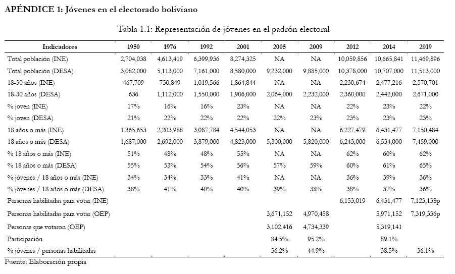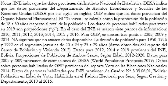 2 Para las elecciones de 2019, se estima que más de un millón de jóvenes se incorporen al padrón electoral (Chuquimia, 2019; La Razón, 2019).