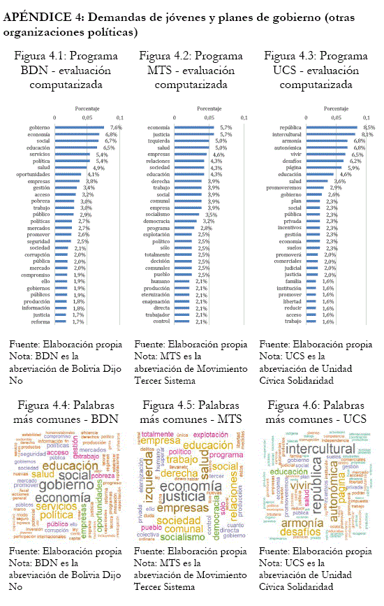 Tomando en cuenta el proceso de Elecciones Generales 2019 en Bolivia, se realizó un análisis de las opiniones de ciudadanos jóvenes con el afán de identificar los temas que más les interesan de cara a la actualidad en Bolivia. Adicionalmente, se comparan las demandas de los ciudadanos con los programas de gobierno de las entidades políticas. De acuerdo a nuestra revisión, no se encontraron otros estudios que analicen las propuestas de este grupo selecto de la población con los métodos y análisis ejecutados en este estudio4. Consideramos que este estudio hace un aporte novedoso porque el análisis sigue un procedimiento tanto manual como computarizado y no se limita solamente a identificar algunos temas de interés sino que también los prioriza, compara con planes de gobierno aplicando procedimientos estandarizados (lo cual hace el contraste de contenidos en textos comparable) y contextualiza desde el punto de vista de políticas públicas.
