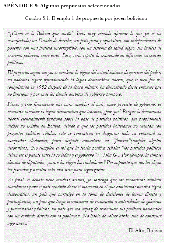 El periodo antes de una elección permite analizar tanto las demandas de los ciudadanos como las propuestas de aquellos que buscan contribuir a su país desde el sector público. Este estudio procura capturar las opiniones de un segmento específico de jóvenes bolivianos respecto a cuál es la Bolivia que ellos quieren. Además del afán escolástico para informar políticas públicas, el estudio también apunta a que existan más medios para que las voces de los ciudadanos sean escuchadas, incluyendo los canales formales del ámbito académico.