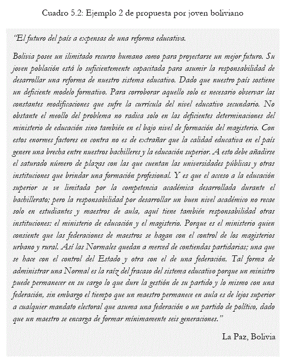 Sin embargo, uno de los jóvenes identifica que en Bolivia las intenciones de buenos maestros o políticas públicas pueden verse truncadas por los intereses de algunos sindicatos que a su vez están a la merced de contiendas partidarias.