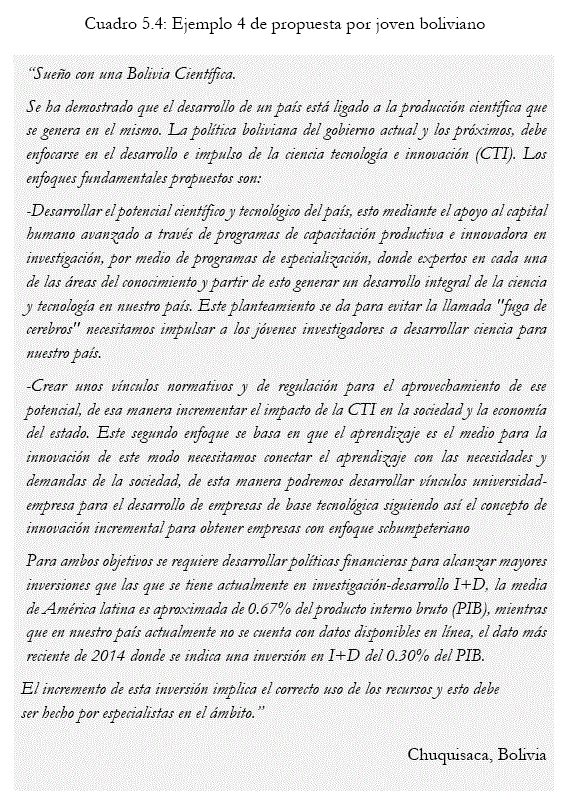 Con relación a este último aspecto, una de las propuestas resalta que la inversión en investigación y desarrollo que se hace en Bolivia no cuenta con datos actualizados y que el último dato (2014) indica que ésta se encuentra por debajo del promedio de Latinoamérica.13 Finalmente, las propuestas no solamente están a favor de la inversión en CTI sino también en favor de no descuidar la madre tierra y que los desarrollos en CTI estén al servicio de pueblos indígenas y comunidades vulnerables.